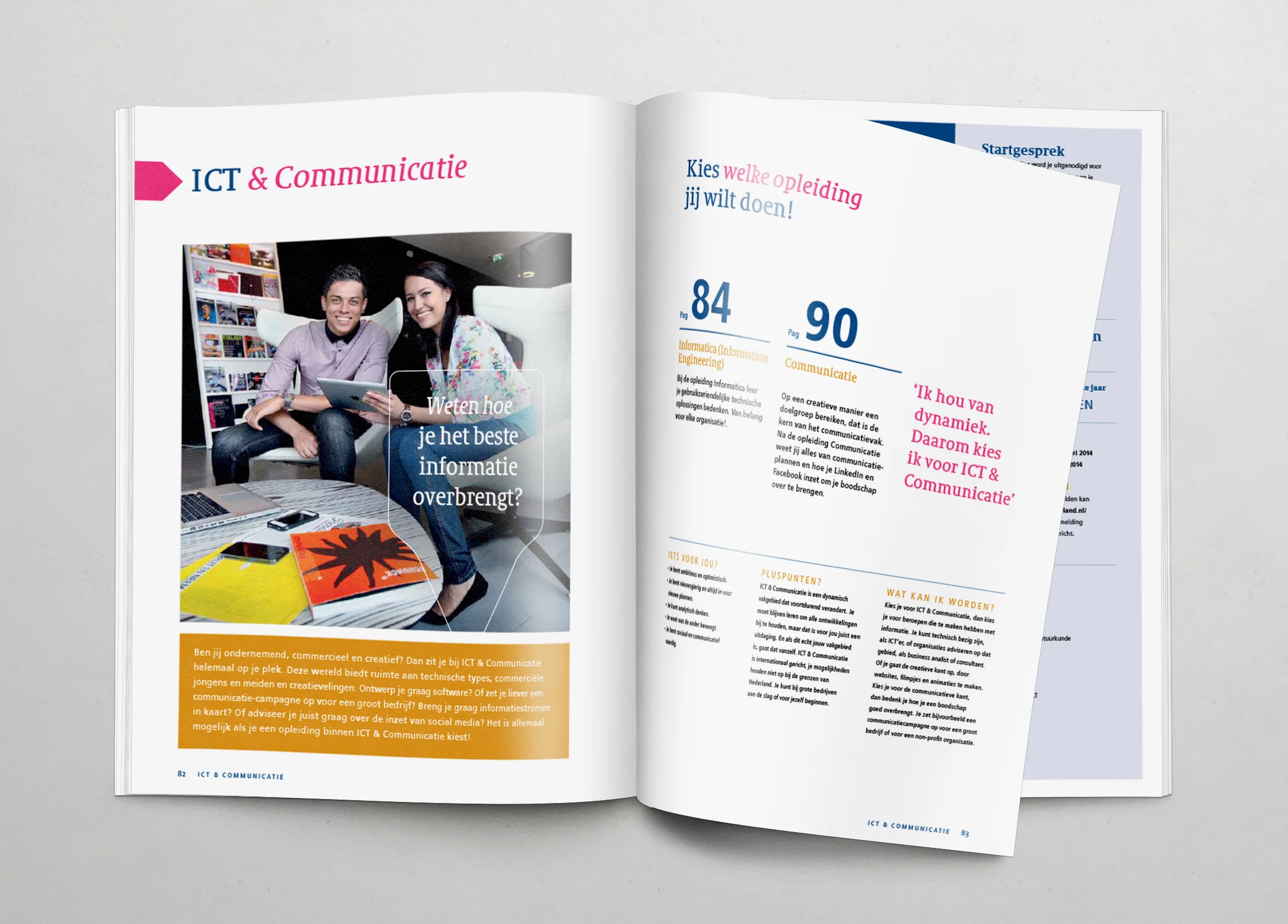 Mooi om te zien: de ontwikkeling van het concept en de vormgeving van de studiegids. Met het eerste concept was men niet tevreden en werd ik 'ingevlogen' om het in verschillende stappen door te ontwikkelen tot een definitief communicatieconcept (laatste beeld). Ontwerp, begeleiding ontwerpers en DTP, fotografie concept en begeleiding.